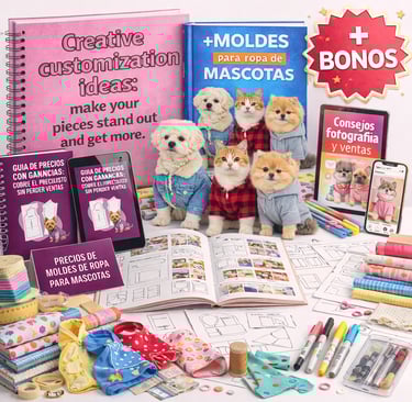 Todo lo que necesitas para crear, personalizar y vender ropa para mascotas usando una colección completa de patrones probados, incluso si estas comenzando desde cero.